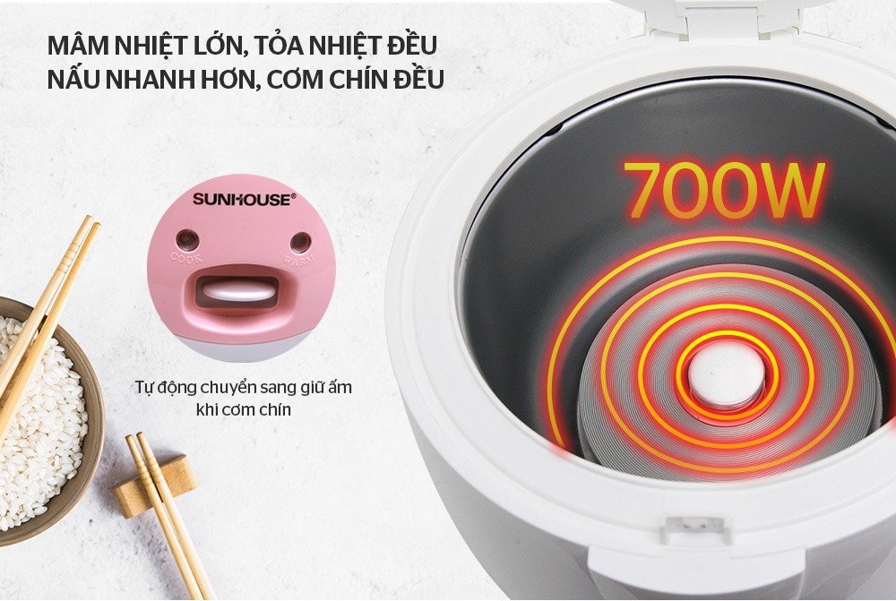 Nồi cơm điện có công suất lớn 700W giúp nhiệt tỏa đều làm cơm chín đều, mềm và ngon hơn.