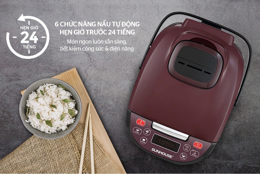 Trang bị hệ thống hẹn giờ nấu tự động (từ 1 – 24 giờ), giúp tiết kiệm thời gian nấu nướng và đảm bảo luôn có cơm ngon mọi lúc. Ví dụ, bạn muốn 6 giờ sáng mai có cơm để ăn sáng thì có thể chế sẵn nước và gạo, chọn hẹn giờ 8 tiếng (từ 10h tối hôm trước) và hôm sau sẽ có cơm dẻo ngon nóng hổi.